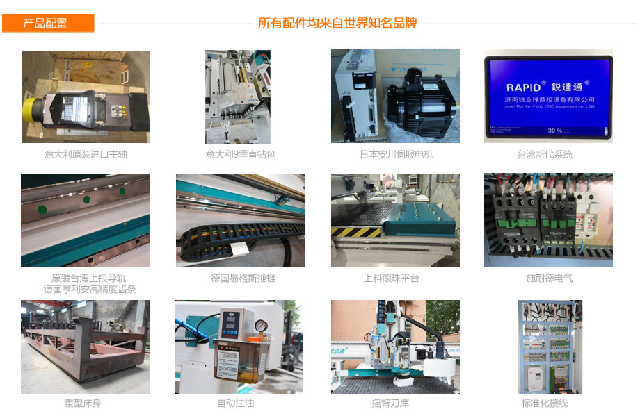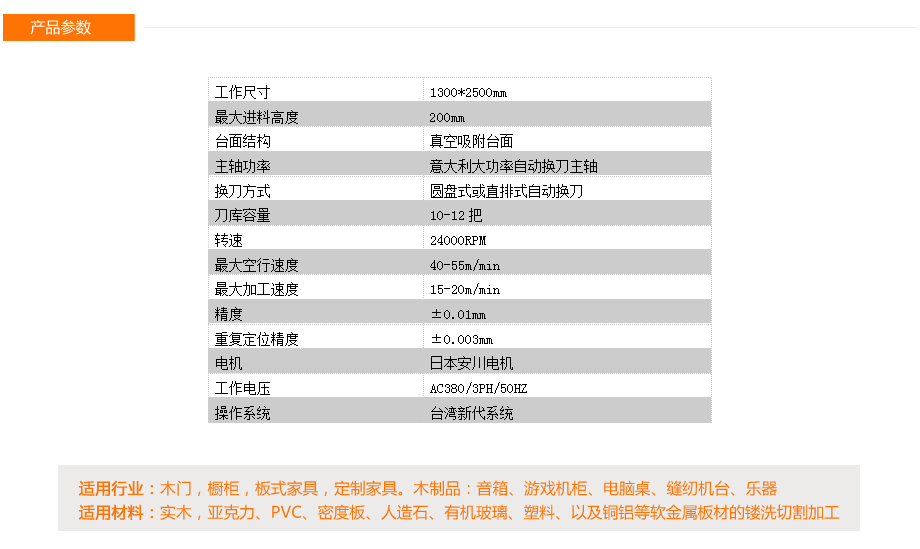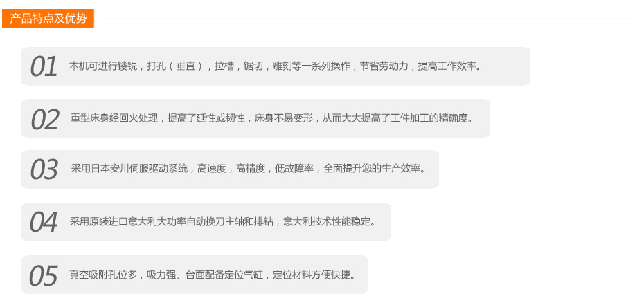 本機(jī)可進(jìn)行鏤銑,打孔(垂直),拉槽,鋸切,雕刻等一系列操作,節(jié)省勞動力,提高工作效率。重型床身經(jīng)回火處理,提高了延性或韌性,床身不易變形,從而大大提高了工件加工的精確度。采用日本安川伺服驅(qū)動系統(tǒng),高速度,高精度,低故障率,全面提升您的生產(chǎn)效率。采用原裝進(jìn)口意大利大功率自動換刀主軸和排鉆,意大利技術(shù)性能穩(wěn)定。真空吸附孔位多,吸力強(qiáng)。臺面配備定位氣缸,定位材料方便快捷。